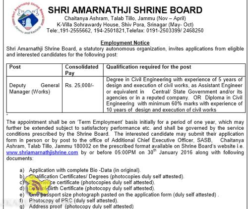 SHRI AMARNATHJI SHRINE BOARD Chaitanya Ashram, Talab Tillo, Jammu (Nov – April) K-Villa Sohrawardy House, Shiv Pora, Srinagar (May- Oct) Tele:,191-2555662, 194-2501821,Telefax: 0191-2503399/ 2468250 Employment Notice Shri Amarnathji Shrine Board, a statutory autonomous organization, invites applications from eligible and interested candidates for the following post: Post Consolidated Pay Qualification required for the post Deputy General