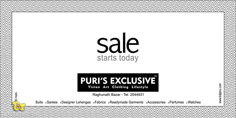 SaleĀ on suits, sarees, designer Lehangas ,Readymade Garments, Fabrics, Accessories, Perfumes, Watches at Puri’s Exculsive Address Raghnath Bazar Tel 2544931