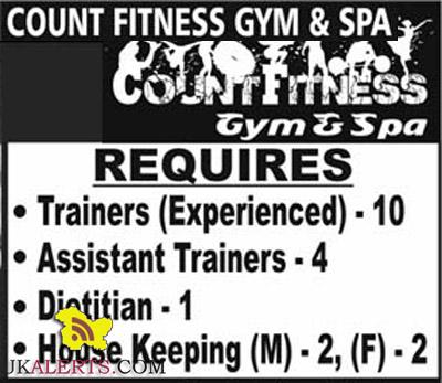 Trainers , Assistant Trainers , Dietitian Jobs in Count Fitness Gym and Spa Vacancy details Trainers (Experienced) 10 Assistant Trainers – 4 Dietitian -1 House Keeping (M) 2, (F) 2 Count Fitness Gym and Spa |First Floor Shanti Complex Near Hindustan Pencil factory Akhnoor Road Jammu 941123472, 9018890117, 01912554466