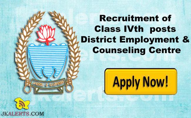DIRECTOR EMPLOYMENT DISTRICT EMPLOYMENT & COUNSELLING CENTRE, BUDGAM CLASS-IV JOBS Jobs Details: Post Name Class ivth Posts Break-up of the posts Open Merit (General): 02 posts / Scheduled Tribe: 01 post / Total: 03 posts Qualification Minimum education Qualification is 10th and maximum is 10+2. Salary : Pay band of Rs.4440-7440 Grade Pay Rs. 1300/-