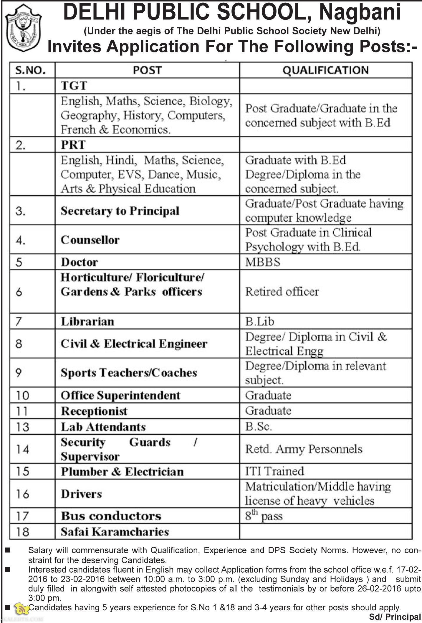 JOBS IN DELHI PUBLIC SCHOOL, Nagbani, DPS SCHOOL Employment News 2016