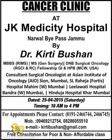 CANCER CLINIC AT JK Medicity Hospital Narwal Bye Pass Jammu By Dr. Kirti Bushan MBBS (RIMS) | MS (Gen Surgery)| DNB Surgical Oncology (RGCI & RC) Fellowship Gl & HPB (MCW, USA) Consultant Surgical Oncologist at Asian Institute of Oncology (AIO) Sion, Mumbai, SL Raheja (Fortis) Hospital Mahim (W) Mumbai | Leelawati Hospital Bandra (W)