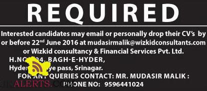 Wizkid consultancy & Financial Services Pvt. Ltd. a Financial and Engineering consultancy company requires following staff for their Srinagar operations. 1. Architect: (1 No.) Qualification: B. Arch. / M. Arch. Experience: Minimum 03 years in relevant field, candidate with landscaping experience will be preferred. 2. Chartered Accountant (CA): (1 No.) Qualification: CA Experience: for Audit,