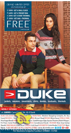 Duke Jackets, sweaters, shirts, denims, tracksuits, thermals [highlight]Grand winter offer on purchase of Rs 1999 get a wall clock Rs 2499 get a bag Rs 2999 get a duke thermal Rs 3999 get a bag + thermal[/highlight] Address : Jammu Canal Road Near J&k Bank