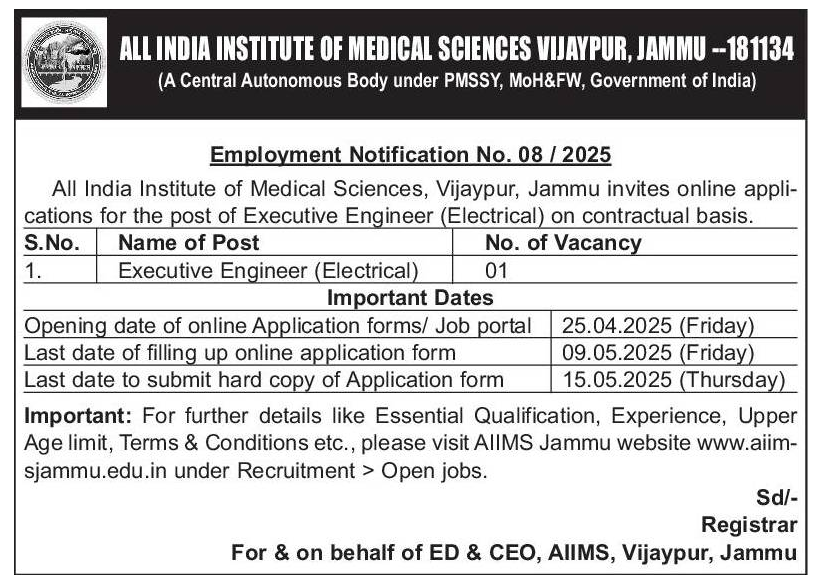 AIIMS Jammu. All India Institute of Medical Sciences, Vijaypur, Jammu invites online applications for the post of Executive Engineer (Electrical) on contractual basis.