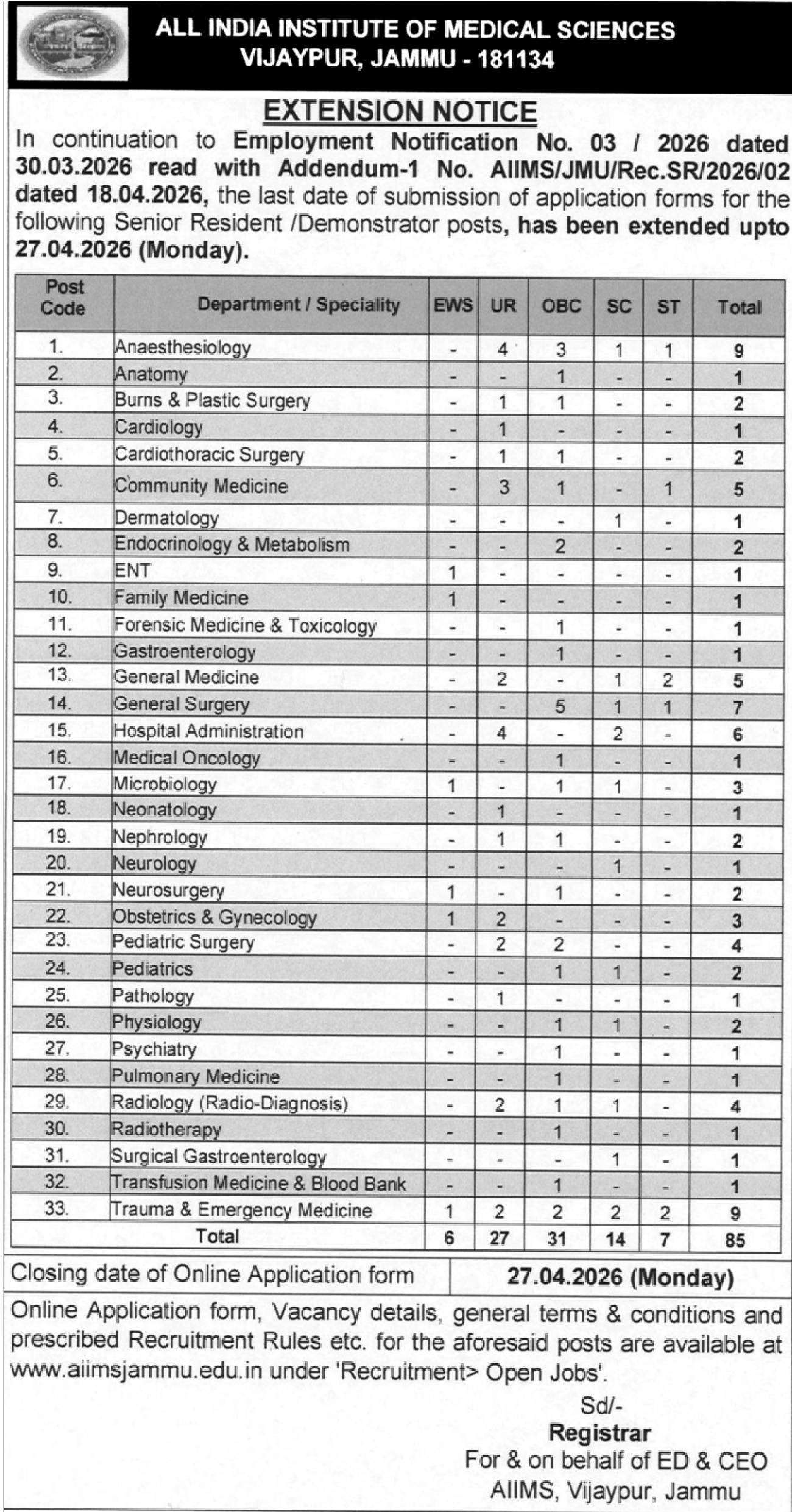 All India Institute of Medical Sciences AIIMS Jammu has issued an extension notice for Senior Resident / Demonstrator posts under Employment Notification No. 03/2026 dated 30.03.2026.