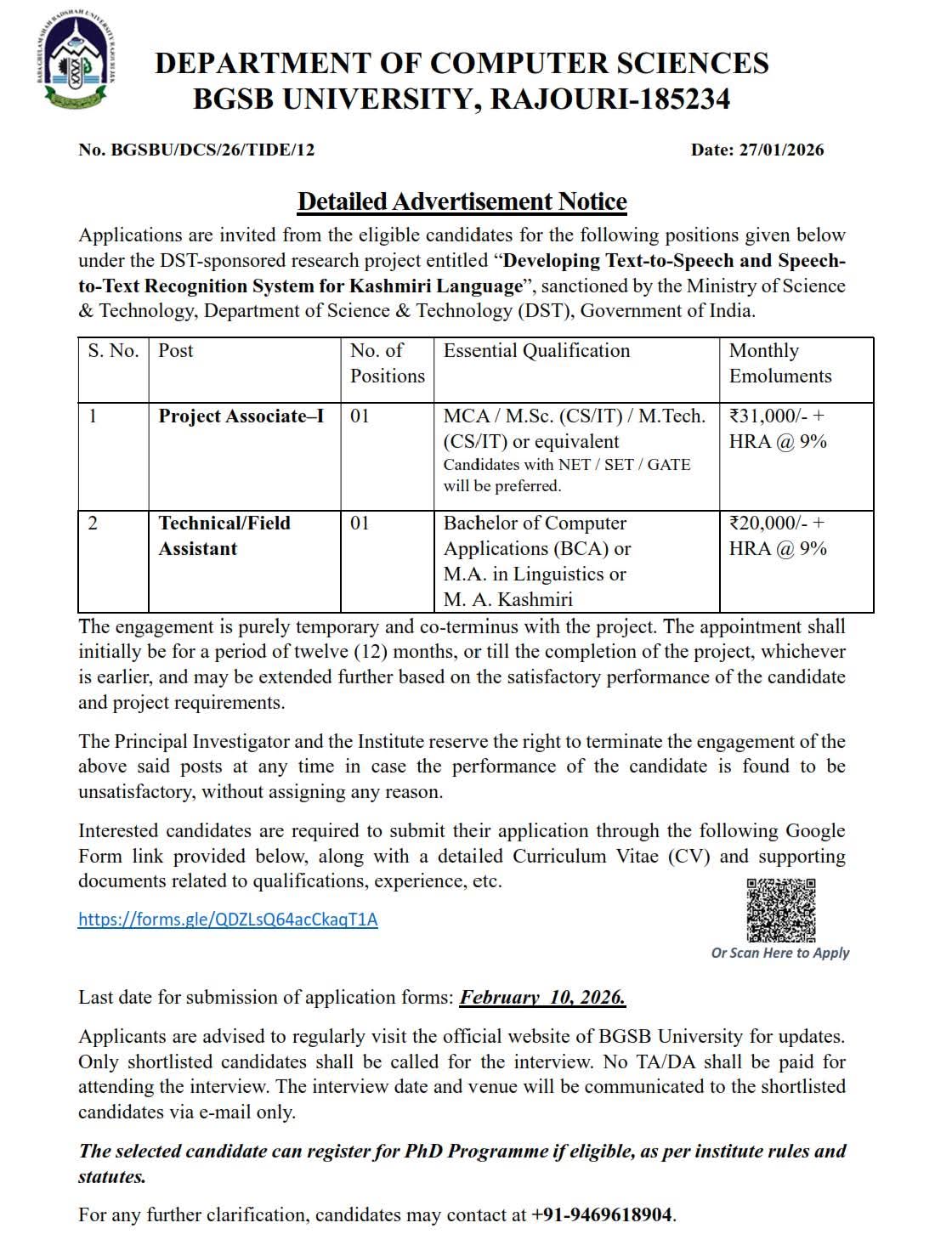 BGSB University Recruitment 2026 Department of Computer Sciences, Baba Ghulam Shah Badshah (BGSB) University, Rajouri has invited applications for temporary project-based positions under a DST-sponsored research project titled “Developing Text-to-Speech and Speech-to-Text Recognition System for Kashmiri Language”.