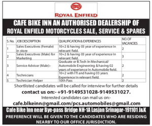 2 Sales Executives (Male) for Marketing 10+2 & having 03 years of experience in relevant field. No. of Vacancies 3