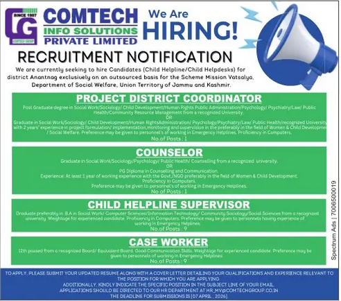Currently seeking to hire Candidates (Child Helpline/Child Helpdesks) for district Anantnag exclusively on an outsourced basis for the Scheme Mission Vatsalya, Department of Social Welfare, Union Territory of Jammu and Kashmir.