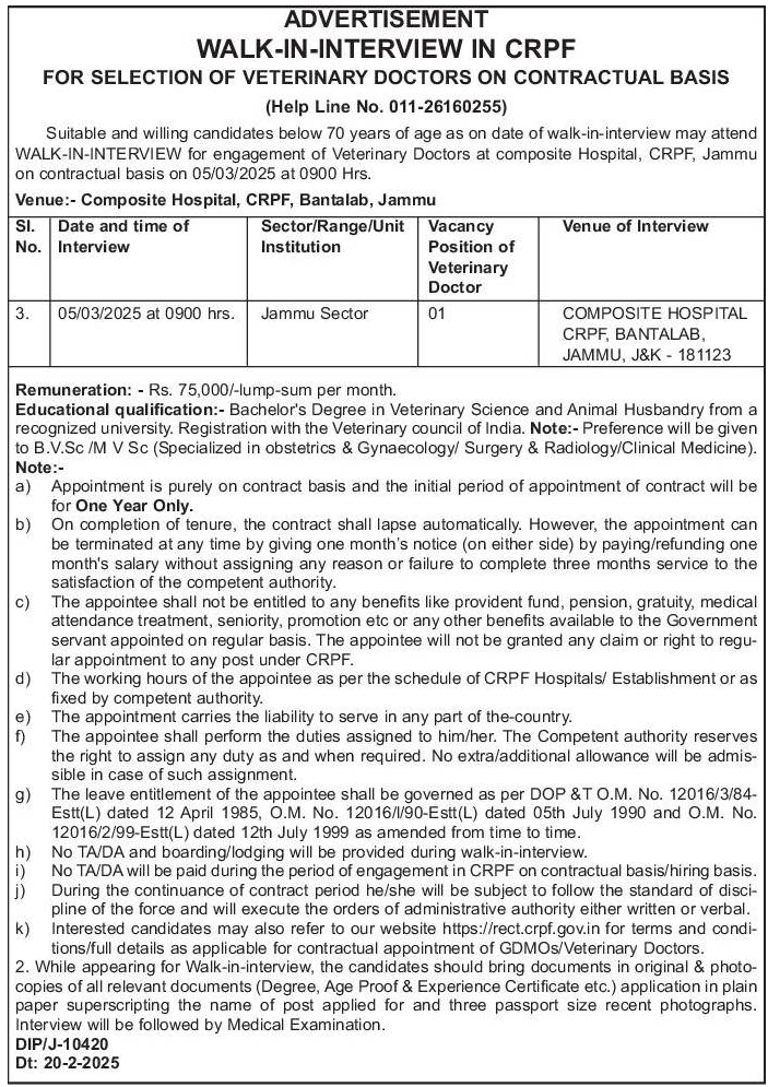 Suitable and willing candidates below 70 years of age as on date of walk-in-interview may attend WALK-IN-INTERVIEW for engagement of Veterinary Doctors at composite Hospital, CRPF, Jammu on contractual basis on 05/03/2025 at 0900 Hrs.