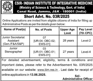 CSIR Recruitment 2025 Junior Secretariat Assistant, Junior Stenographer vacancies.