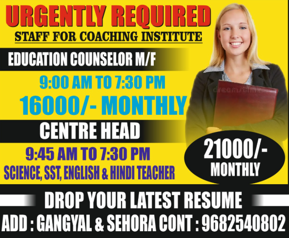Jammu Jobs in Coaching Institute Jammu Jobs Education Councelor, Centre Head, Teacher vacancies.