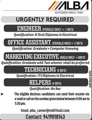 Engineer, Office Assistant, Marketing Executive, Technicians, Helpers Jobs in ALBA