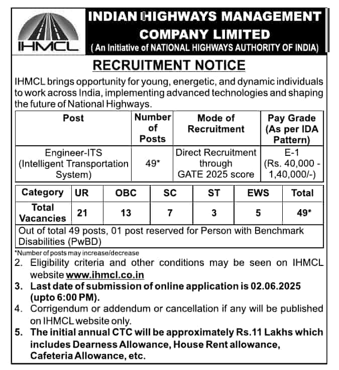 IHMCL Jobs Indian Highways Management Company Limited opportunity for young, energetic, and dynamic individuals to work across India, implementing advanced technologies and shaping the future of National Highways.