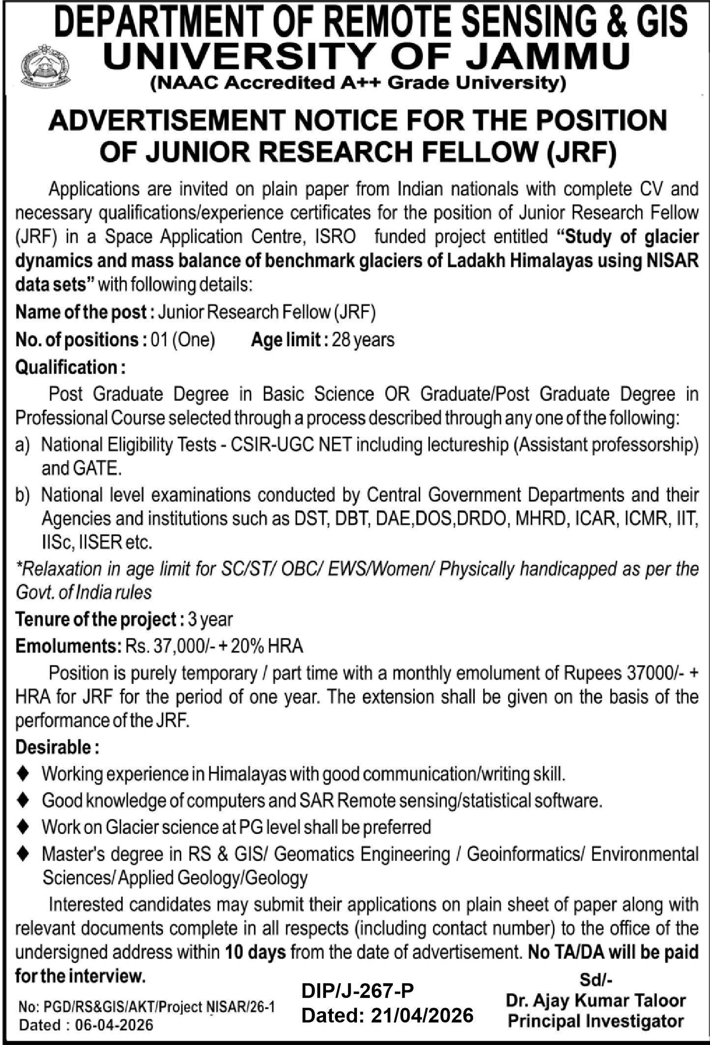 Applications are invited on plain paper from Indian nationals with complete CV and necessary qualifications/experience certificates for the position of Junior Research Fellow (JRF) in a Space Application Centre, ISRO funded project entitled “Study of glacier dynamics and mass balance of benchmark glaciers of Ladakh Himalayas using NISAR data sets” with following details: