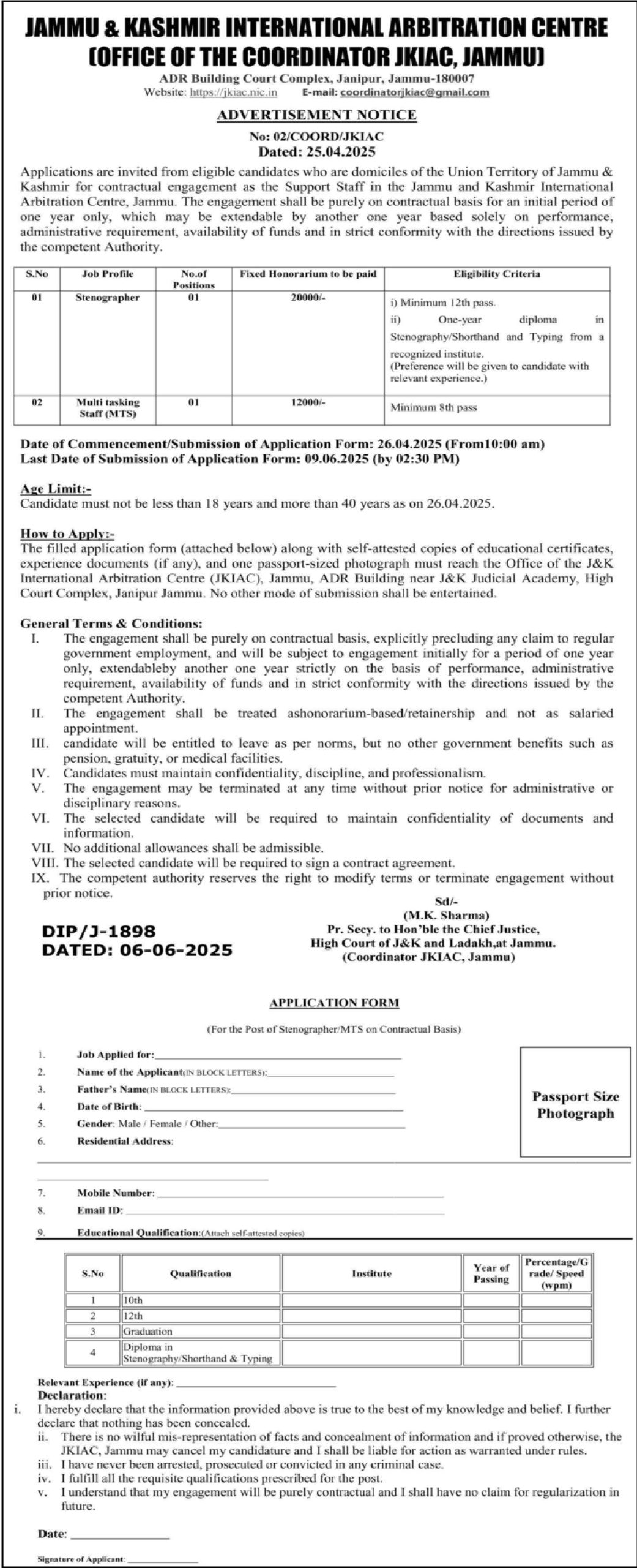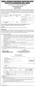 How to Apply :- The filled application form (attached below) along with self-attested copies of educational certificates, experience documents (if any), and one passport-sized photograph must reach the Office of the J&K International Arbitration Centre (JKIAC), Jammu, ADR Building near J&K Judicial Academy, High Court Complex, Janipur Jammu. No other mode of submission shall be entertained.