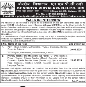URI Jobs: KV URI interview will be conducted to prepare the 1st of teachers on pure part time/contract basis for the session 2025-26 for the following posts in Kendriya Vidyalaya NHPC URI as per the following details. On the day of interview, candidates should appear in the school as per the given dates and time with completely filed application form, passport size photo and all certificates in original along with one set of photocopies.