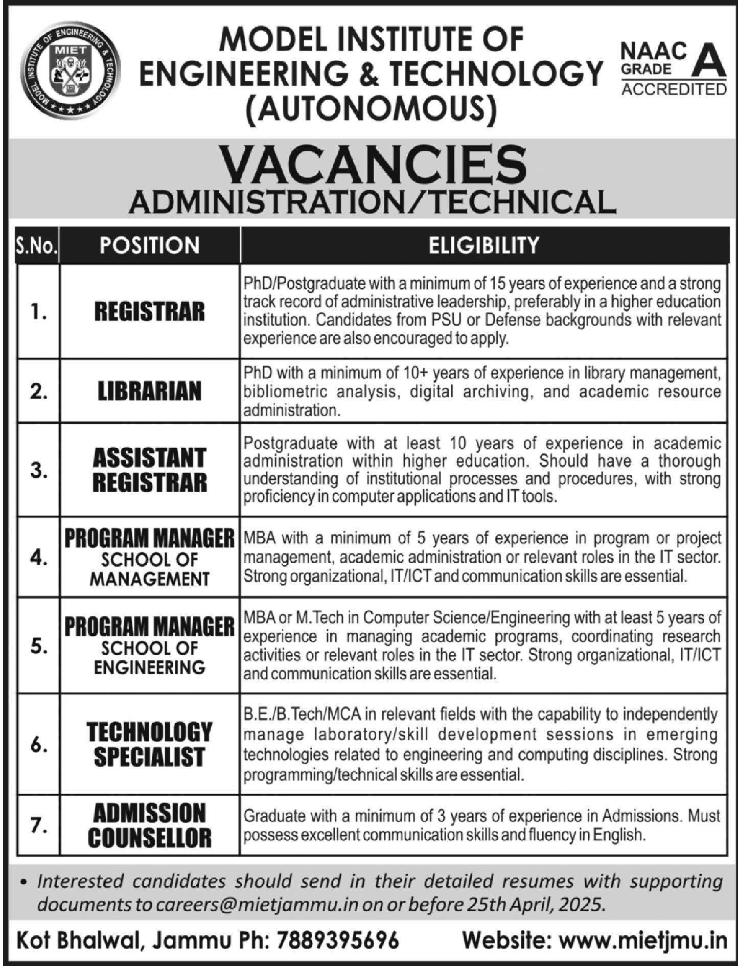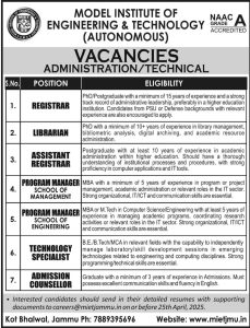 MIET JAMMU JOBS ADMINISTRATION/TECHNICAL VACANCIES
