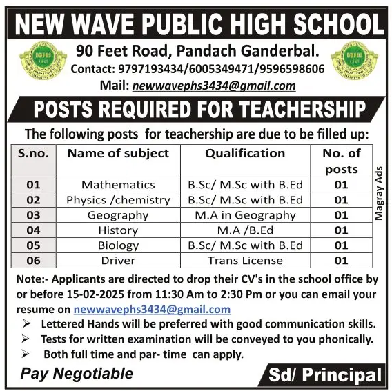 Applicants are directed to drop their CV’s in the school office by or before 15-02-2025 from 11:30 Am to 2:30 pm or you can email your resume on [email protected]