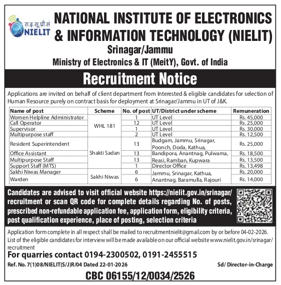 National Institute of Electronics & Information Technology (NIELIT), Srinagar/Jammu, under Ministry of Electronics & IT (MeitY), Govt. of India, has invited applications for contractual posts for deployment in Jammu & Kashmir (UT).