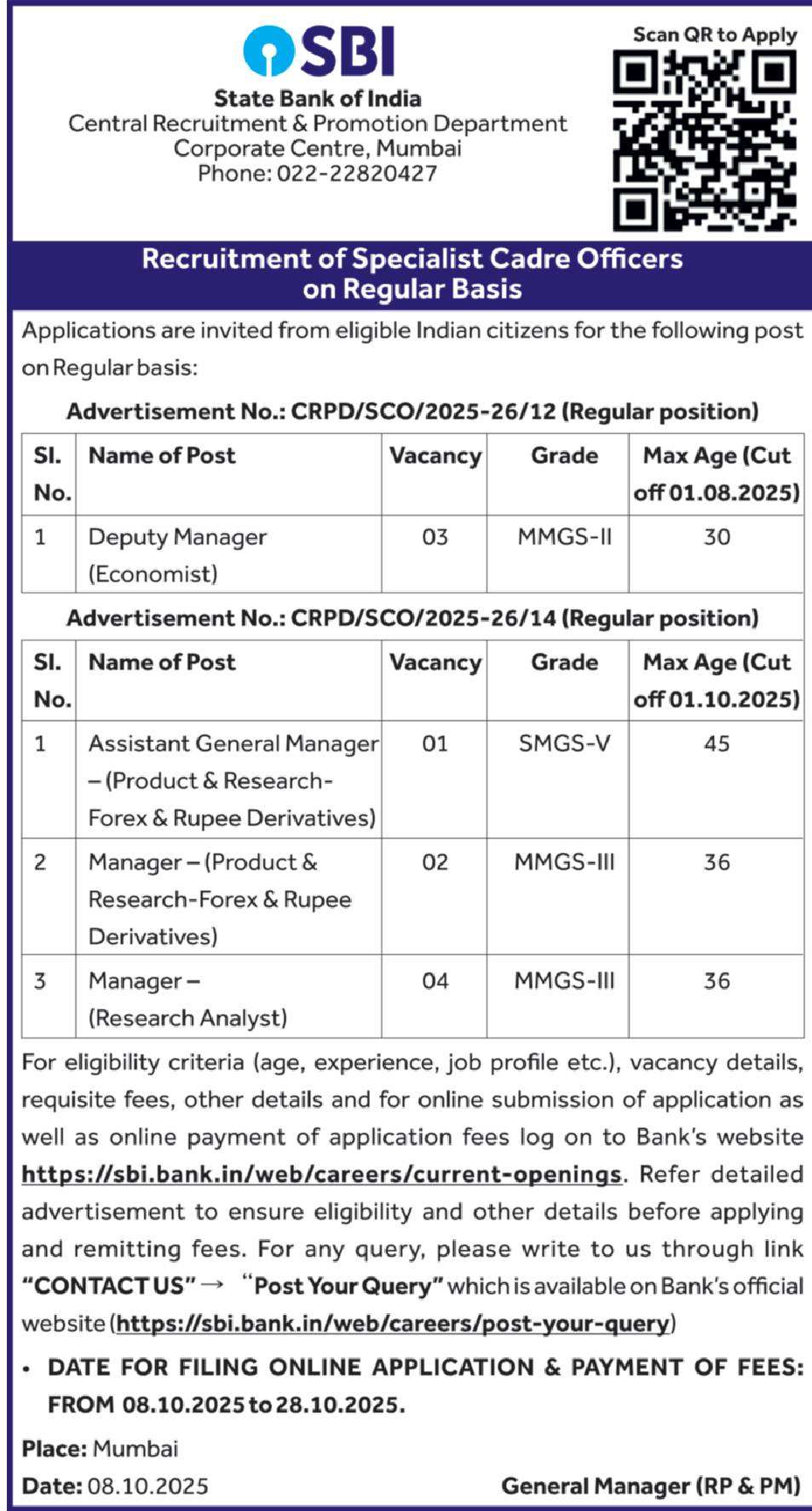 - SBI Recruitment 2025 Specialist Cadre Officers posts.