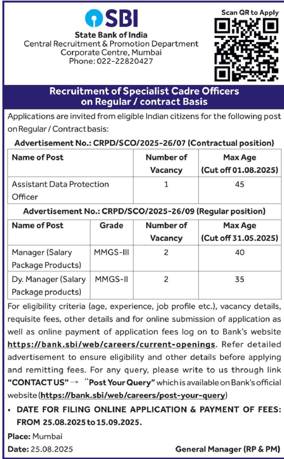 - SBI Recruitment 2025 Specialist Cadre Officers posts.