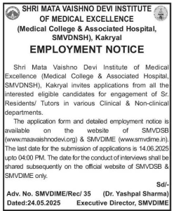 SMVDNSH Jobs Shri Mata Vaishno Devi Institute of Medical Excellence (Medical College & Associated Hospital, SMVDNSH), Kakryal invites applications from all the interested eligible candidates for engagement of Sr. Residents/ Tutors in various Clinical & Non-clinical departments.