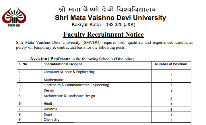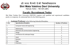 SMVDU Faculty Jobs Shri Mata Vaishno Devi University inviets applications from eligible, well qualified and experienced candidates for the post of Assistant Professor on temporary and contractual basis at various Schools as per eligibility criteria prescribed by relevant regulatory bodies i.e. UGC/ AICTE/ CoA.