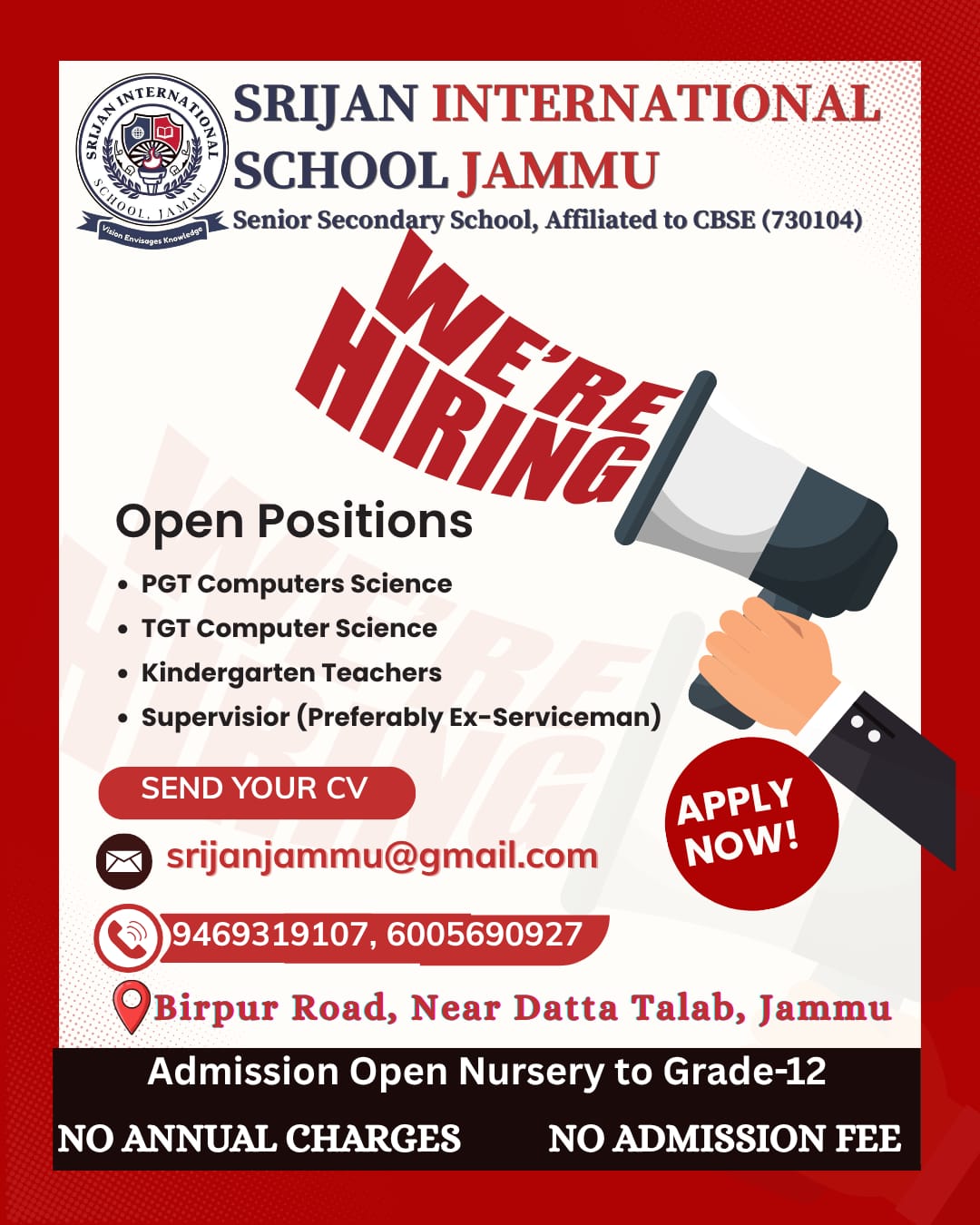 Srijan International School Jammu Jobs Hiring for PGT, TGT, Kindergarten, Supervisor Positions.
