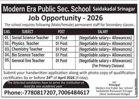 Modern Era Public Sec. School Saidakadal Srinagar Teacher Jobs Opportunity – 2026
