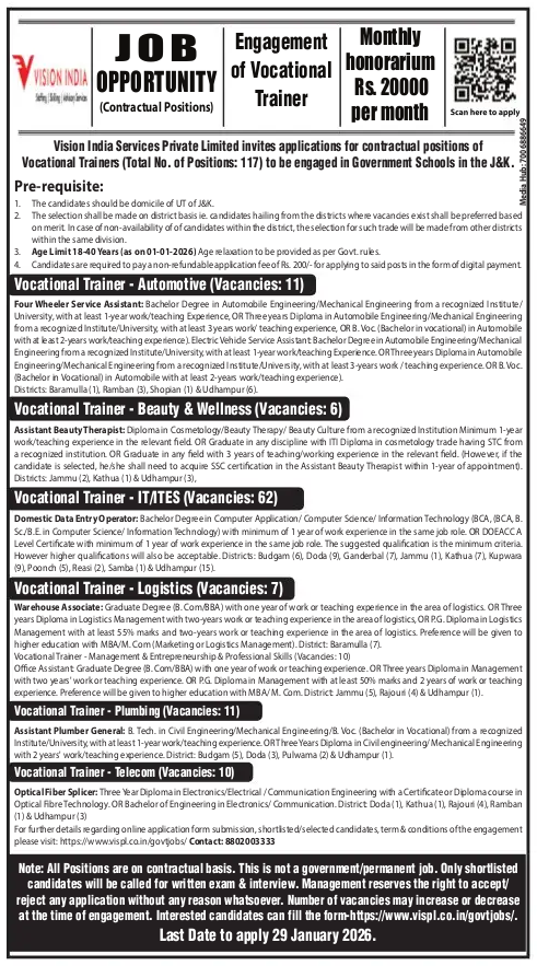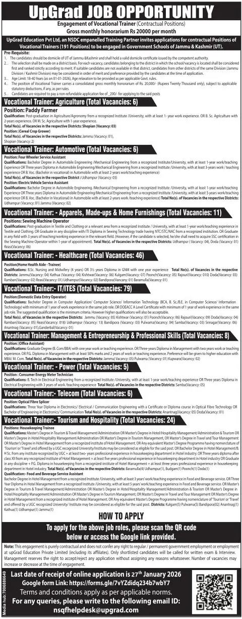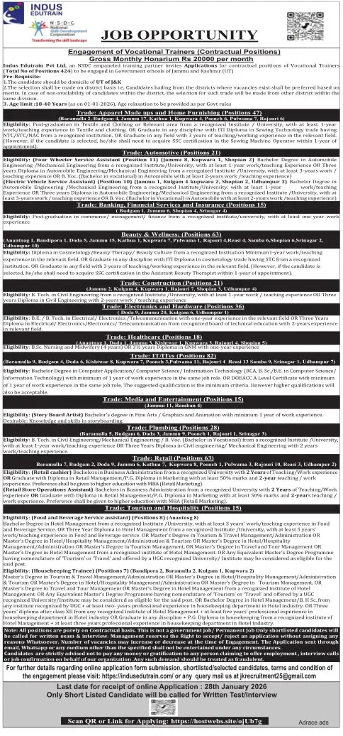 Trainers Jobs: NSDC-empanelled Training Partners have invited online applications for engagement of Vocational Trainers (Contractual Basis) in Government Schools of Jammu & Kashmir (UT).