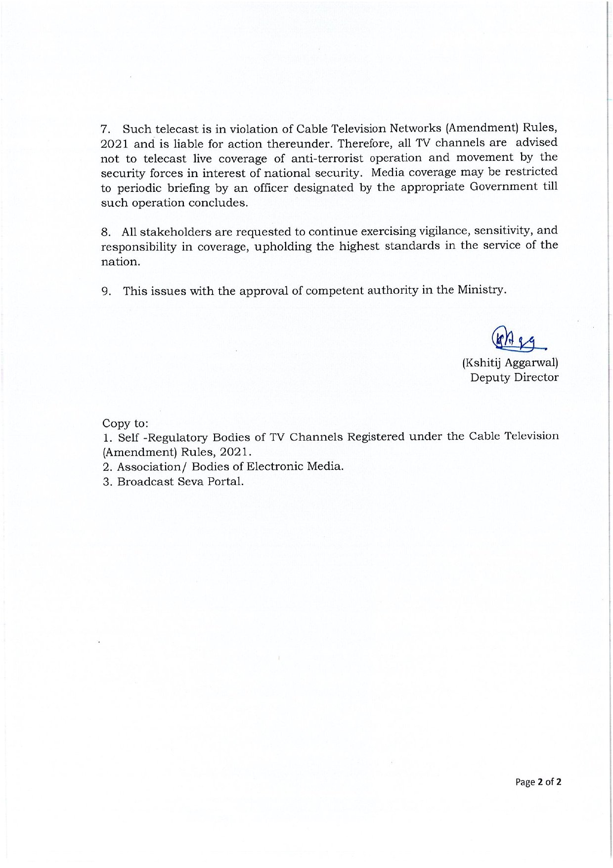 media advisory 1 Advisory to all Media channels to refrain from showing live coverage of defence operations and movement of security forces in the interest of national security.