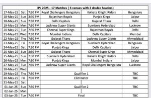 BCCI is pleased to announce the resumption of the TATA IPL 2025. A total of 17 matches will be played across 6 venues, starting May 17, and culminating in the final on June 3. The revised schedule includes two double-headers, which will be played on two Sundays. The playoffs are scheduled as follows: