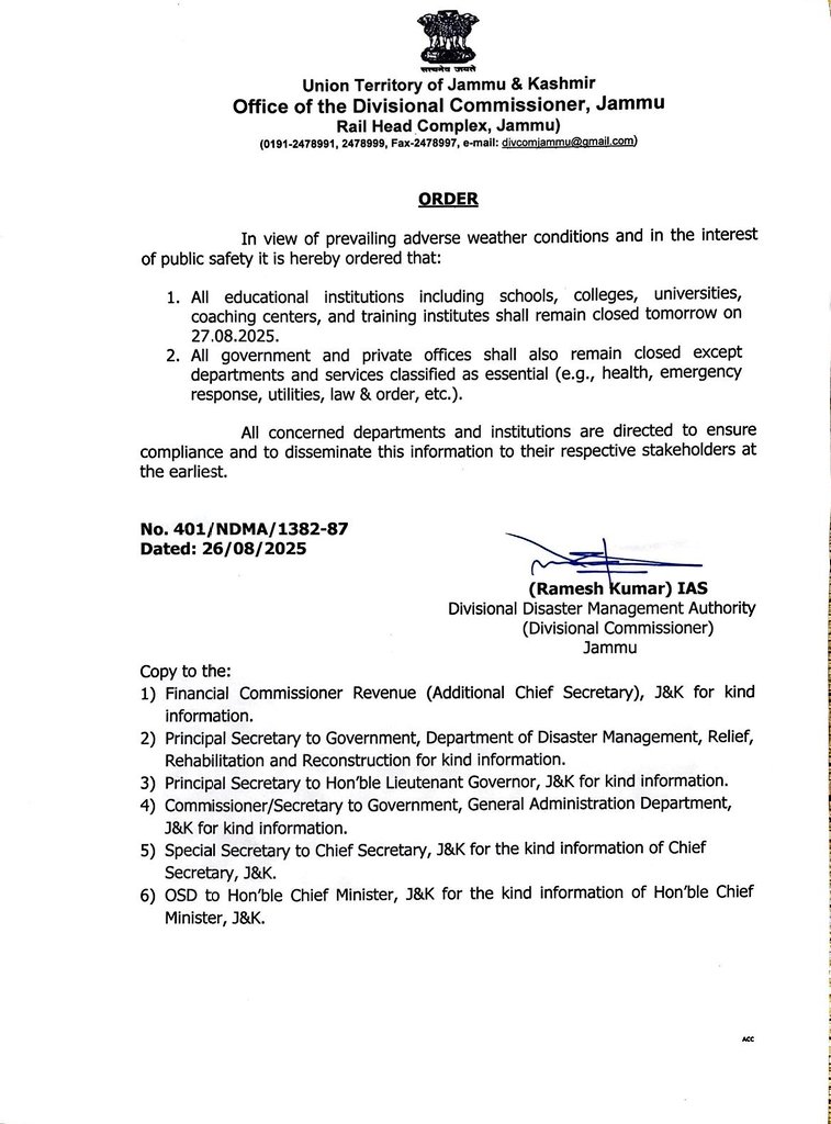 In view of prevailing adverse weather conditions and for public safety all educational institutions including schools, colleges, universities, coaching centres, and training institutes shall remain closed tomorrow on 27.08.2025. All government and private offices shall also remain closed except departments and services classified as essential (e.g. health, emergency response, utilities, law & order, etc.)