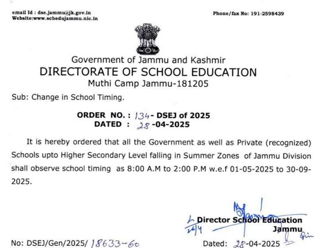Jammu School Timing Changed: It is hereby ordered that all the Government as well as Private (recognized) Schools upto Higher Secondary Level falling in Summer Zones of Jammu Division shall observe school timing as 8:00 A.M to 2:00 P.M w.e.f 01-05-2025 to 30-09-2025.