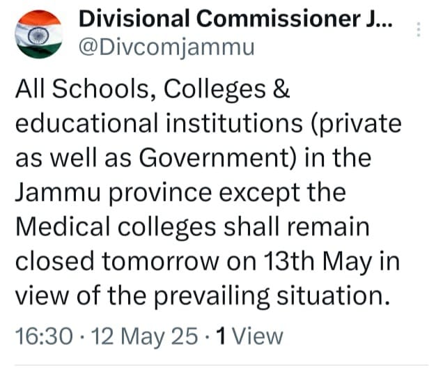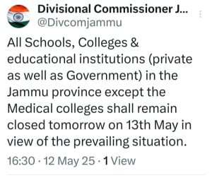 JAMMU: All Schools, Colleges & educational institutions (private as well as Government) in the Jammu province except the Medical colleges shall remain closed tomorrow on 13th May in view of the prevailing situation.