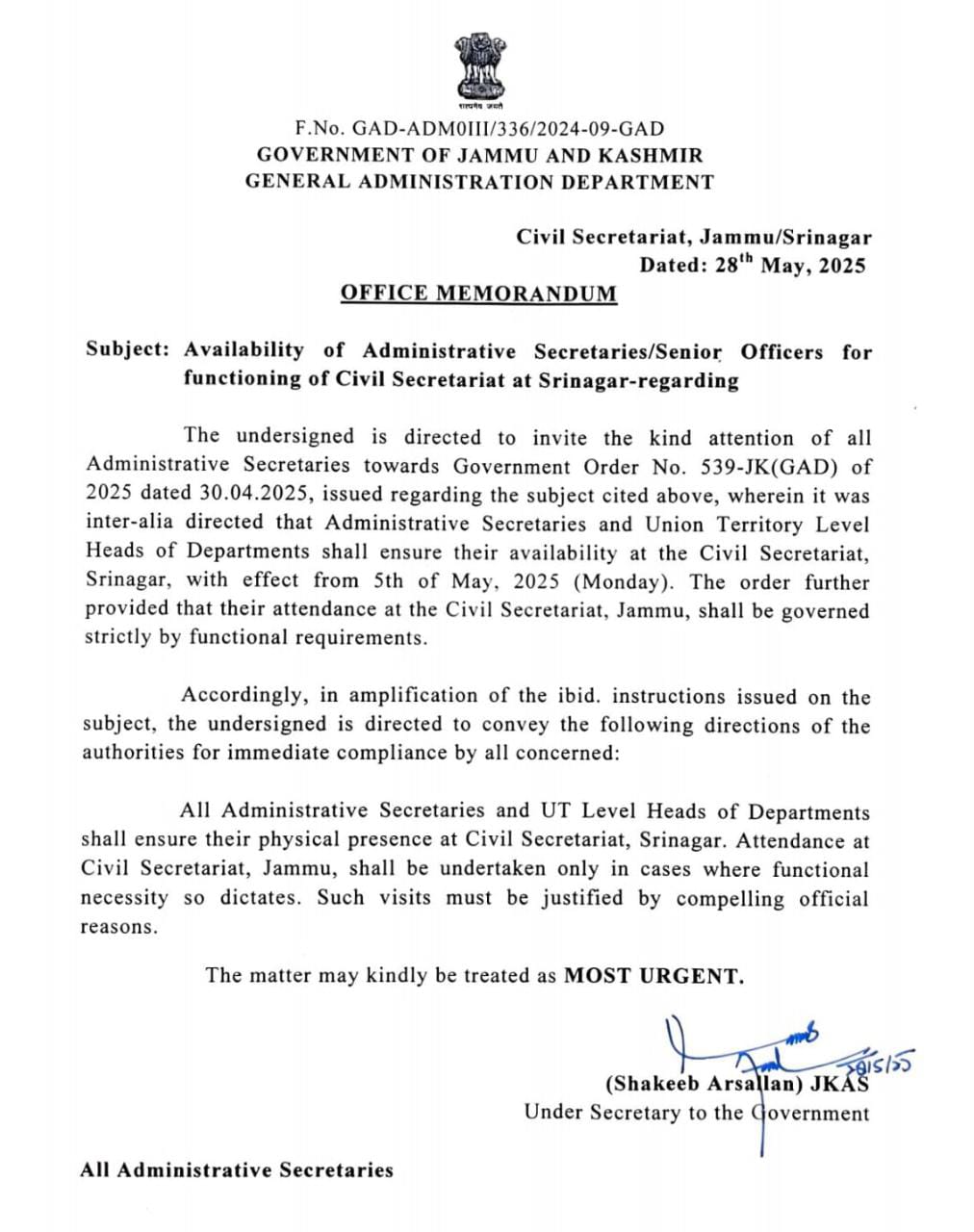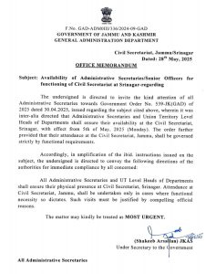 J&K Government has issued an urgent directive mandating the physical presence of all Administrative Secretaries and Union Territory Level Heads of Departments at the Civil Secretariat in Srinagar.
