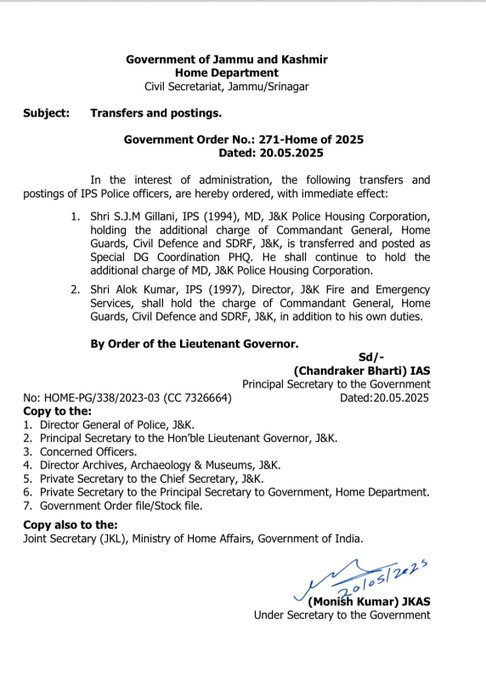 The Home Department of the Jammu and Kashmir Government has ordered the transfer and posting of two senior IPS officers.