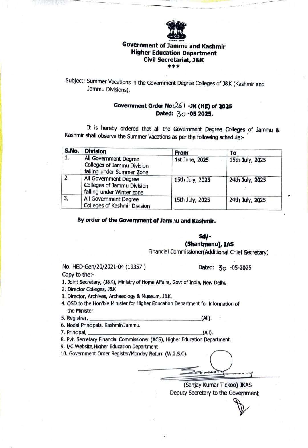 It is hereby ordered that all the Government Degree Colleges of Jammu & Kashmir shall observe the Summer Vacations as per the following schedule :-