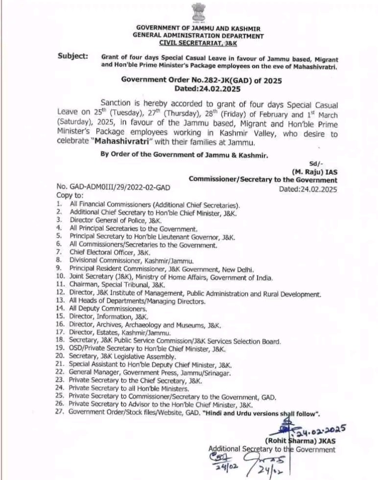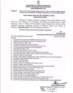 Govt grants 4-day Special Casual Leave in favour of Jammu based Migrant, PM Package employees on Mahashivratri.