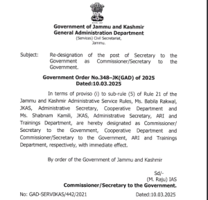 JKGAD Re-designation of Secretary to the Govt as Commissioner/Secretary to the Govt