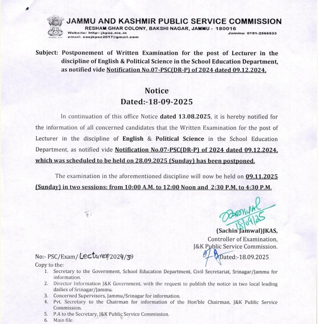 Jammu and Kashmir Public Service Commission JKPSC Postponement of written examination for the post of Lecturer in the discipline of English and Political Science in School Education Department.