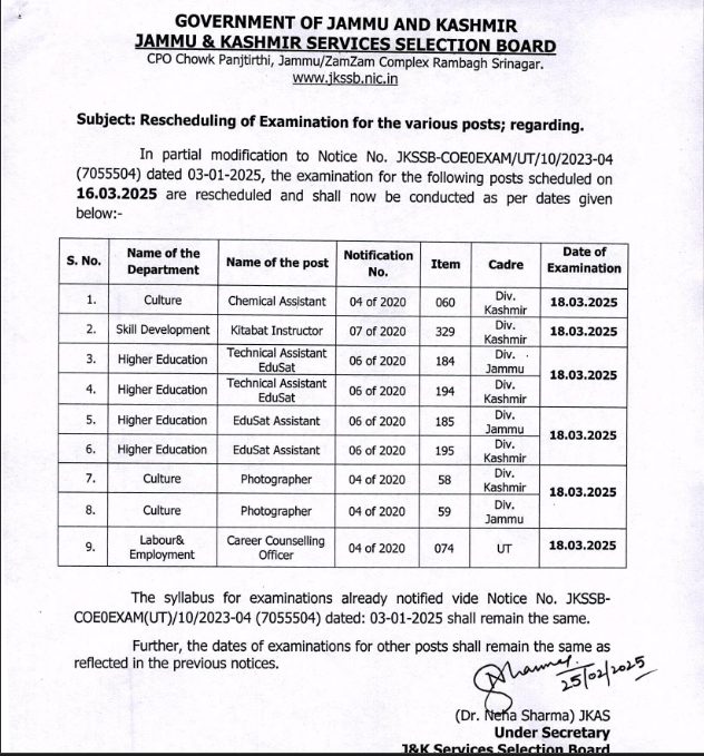 Jammu and Kashmir Service Selection Board JKSSB Rescheduled Exam for the various posts.