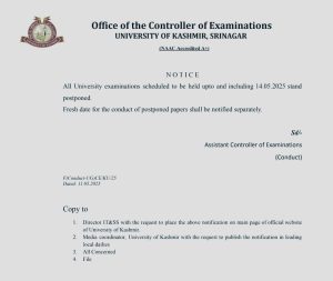 University of Kashmir has postponed all examinations scheduled up to and including May 14.