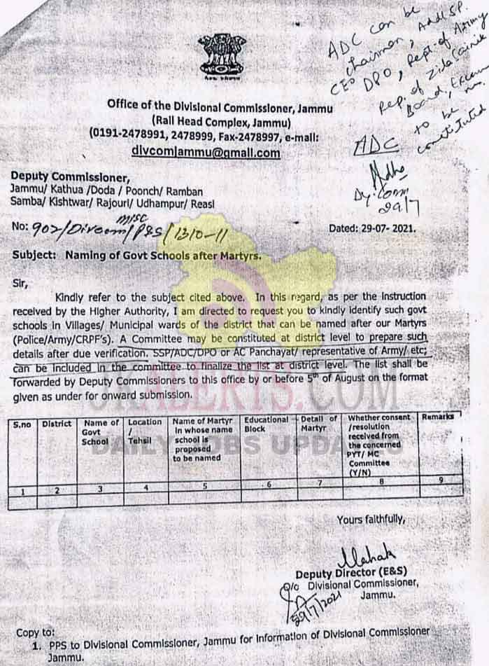Divisional Commissioner Jammu writes to Deputy Commissioner of Jammu, Doda, Reasi, Poonch, Rajouri, Kathua, Samba, Ramban, Kishtwar and Udhampur to identify govt schools, which can be named after martyrs Police, Army, CRPF.