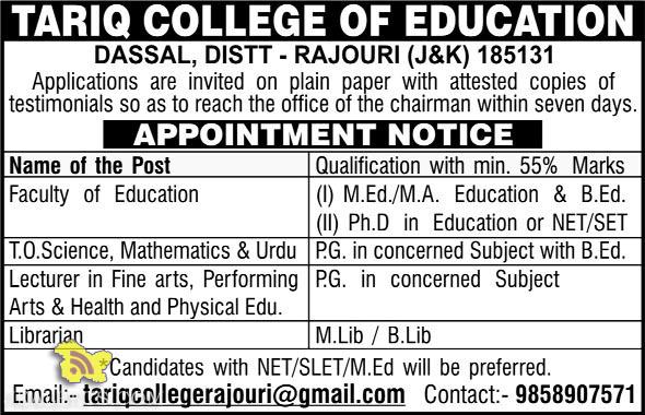 TARIQ COLLEGE OF EDUCATION DASSAL, DISTT – RAJOURI (J&K) 185131 Applications are invited on plain paper with attested copies of testimonials so as to reach the office of the chairman within seven days. APPOINTMENT NOTICE Name of the Post Qualification with min. 55% Marks Faculty of Education (I) M.Ed./M.A. Education & B.Ed. (II) Ph.D in Education